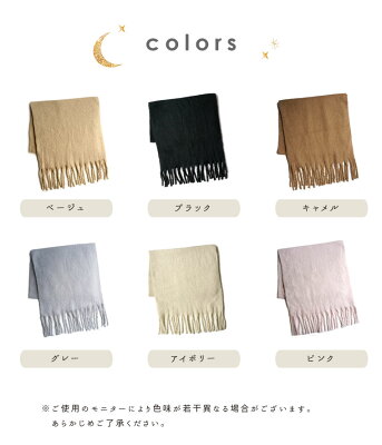 ▼カラーバリエーション ベージュ ブラック キャメル グレー アイボリー ピンク ▼素材 ポリエステル100% ▼サイズ 約190cm×約50cm フリンジ約6cm ▼注意事項 ・使用するパソコンのモニター設定や部屋の照明により多少、色の変化が感じられる場合がございます。