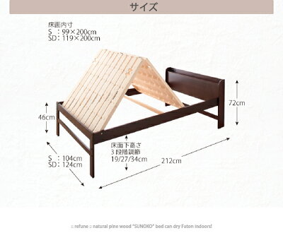 部屋の中で布団が干せる 高さ調節付き天然木すのこ refune リフューネ セミダブル 「家具 インテリア すのこベッド 天然木パイン材 高さ調節3段階 コンセント付 棚付き 耐荷重240kg」
